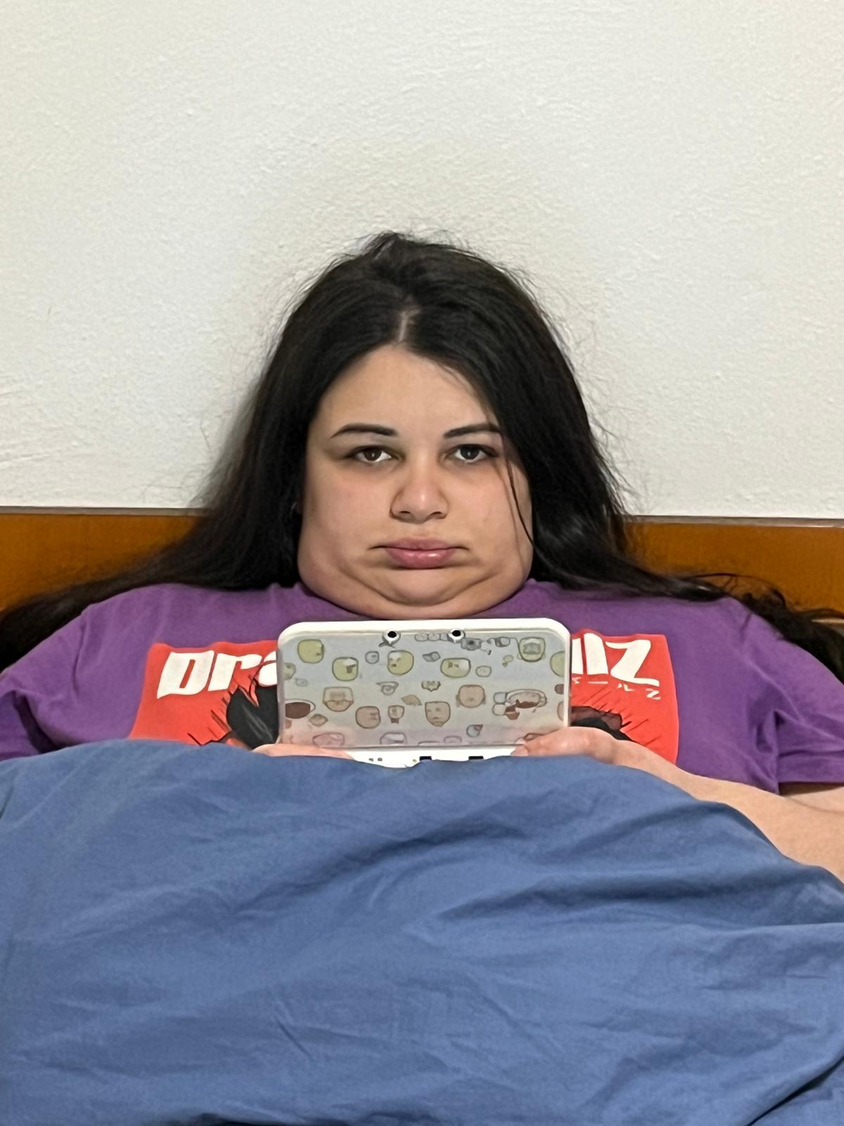 Una Carmela selvatica nel suo habitat naturale, sdraiata sul letto con triplo mento, mentre gioca con il Nintendo 3DS. Foto scattata a Dicembre 2024. Voci di corridoio dicono che abbia iniziato dieta e palestra e abbia trascinato Lorenzo con lei, chissà se è vero.